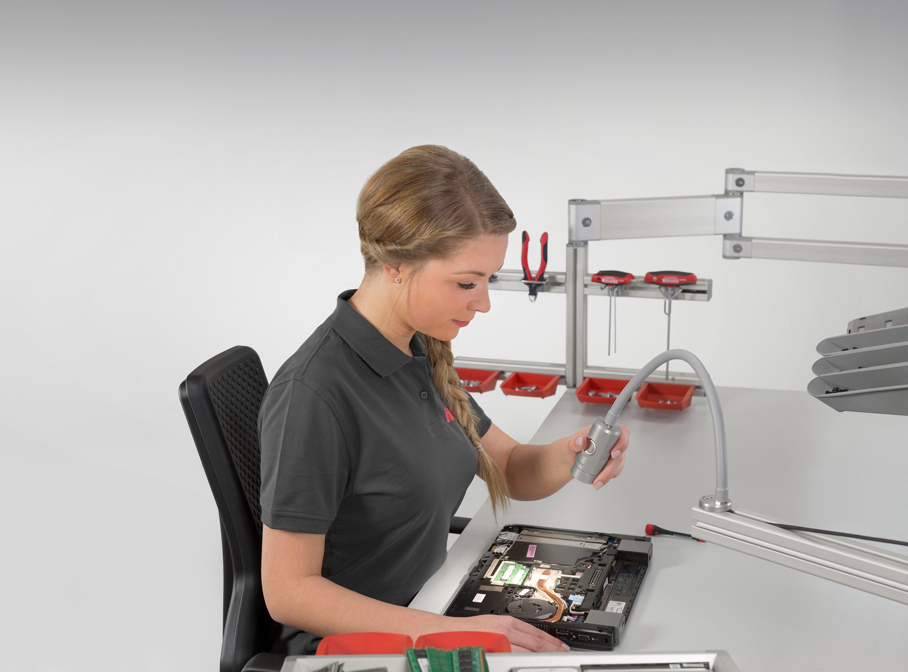 Various aspects need to be considered to ensure work benches benefit from ideal lighting. The first step is to analyse the current situation at the work bench. Ambient lighting must also be taken into account, as it is usually insufficient. Planners need to work with staff to analyse what exactly they need to be able to see to carry out their activities at the work bench. The next step is to select lighting equipment that exhibits the necessary illuminance – a measure of how much light reaches a surface. Illuminance of 300 lux is entirely sufficient when carrying out general activities or working with machine tools, for instance. In contrast, delicate and complex tasks, as conducted in electronics workshops, require at least 1,500 lux.