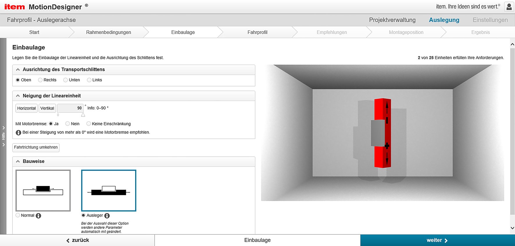 Digitalisation is a real hit at item. The Solingen-based company has once again enhanced its item MotionDesigner® selection and configuration software. The online tool now supports the reliable design of cantilever axes. In these systems, the carriage is fixed firmly in place, with the linear unit moving instead to perform pick-and-place tasks, for example. The racks used in the Line 8 profile groove of the cantilever axis ensure excellent rigidity, even in vertical applications. item MotionDesigner® automatically calculates the maximum support span that must not be exceeded if the system is to run smoothly. Complex calculations are thus a thing of the past, which significantly speeds up the engineering process. As the integration of the cantilever axes leads to a high level of positioning accuracy, complex tasks such as in 3D printing and the execution of weld seams can also be configured. item MotionSoft® software has also been revamped and enhanced for commissioning cantilever axes. As usual, data is taken directly from item MotionDesigner®.